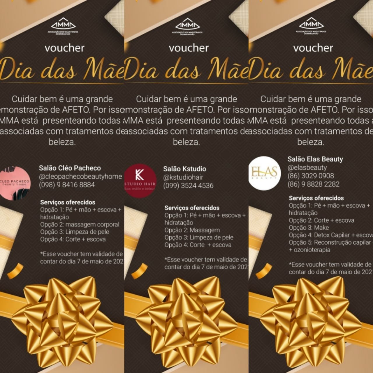 Para as associadas de Imperatriz, a AMMA destinou voucher do salão Kstudio, também com quatro pacotes de excelentes serviços à escolha das mães agraciadas. Prazo de validade do voucher é de 60 dias.