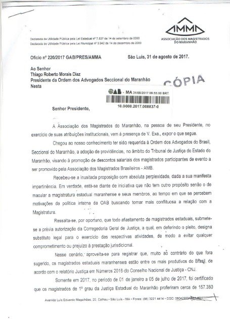 A Associação dos Magistrados do Maranhão (AMMA) protocolou, nesta quinta-feira (31), ofício na seccional da Ordem dos Advogados do Maranhão (OAB-MA), manifestando repúdio, direto e…